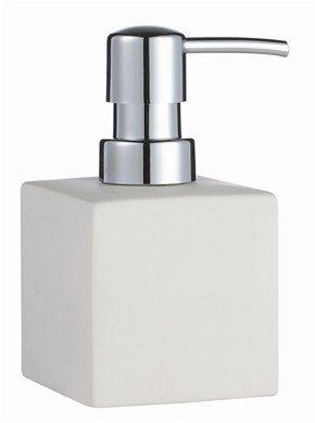 Der Seifenspender ist aus Ceramic hergestellt. Die Außenseite wurde mit einem weißem Gummispray behandelt, so dass der Seifenspender eine griffige, matte Oberfläche erhält und einen stabilen Stand findet.